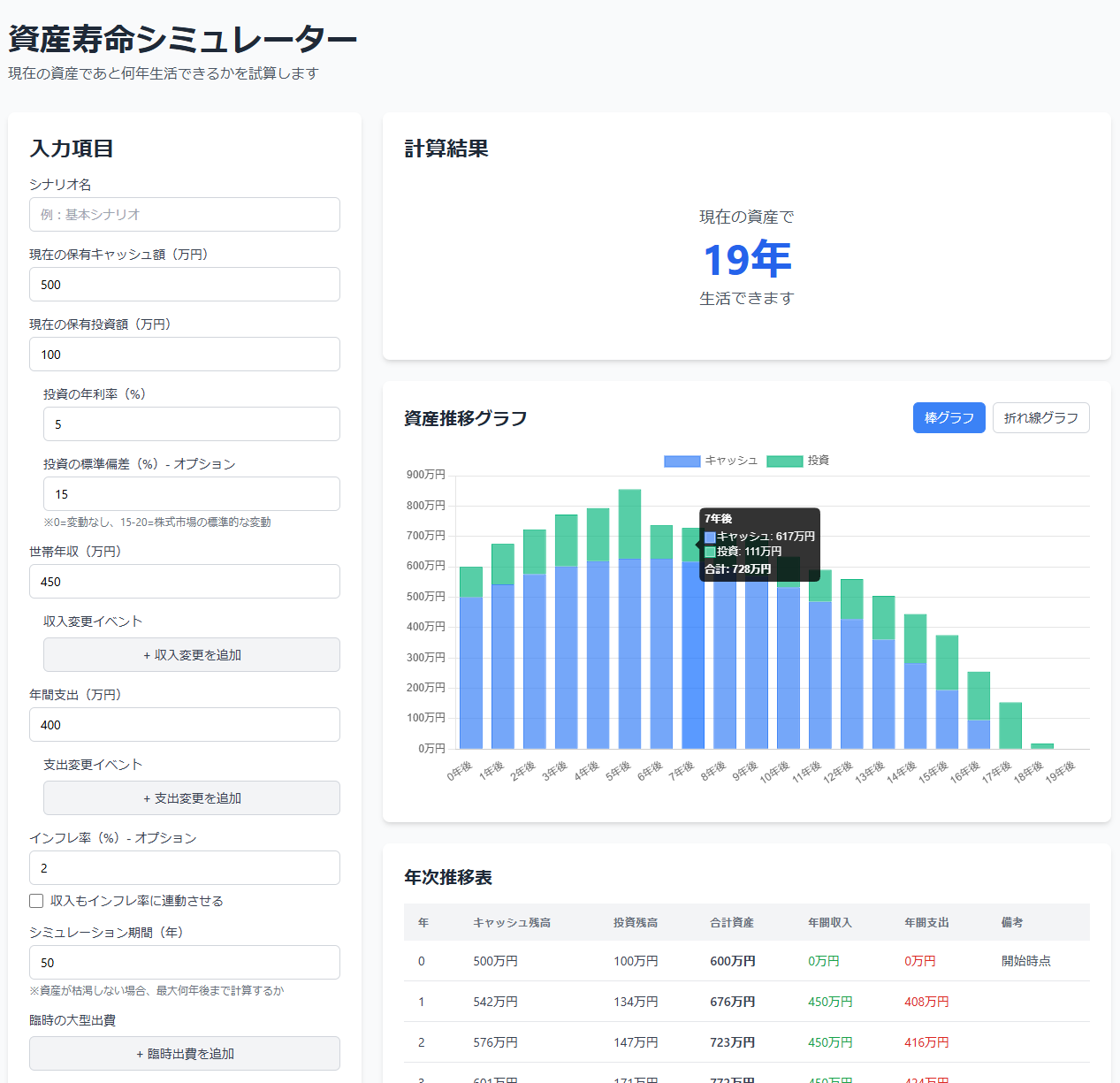 しかし今回リリースした資産寿命シミュレータでは、住宅ローンに限らず、生活全体の収入と支出を計算に加え、自分や家族の生活があと何年もつのか、死ぬまで大丈夫そうなのかどうかを詳しく試算できるようにしました。