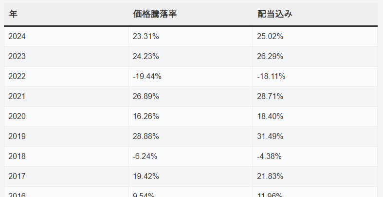 ※参考までに、2025年はまだ年途中ですが、同サイトでは2025年10月24日終値時点で「価格+15.47%、配当+1.21%、配当込み+16.68%」と更新されています(上表には含めていません)。スリックチャート